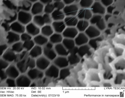 Фото: Микроскопска снимка (изглед одгоре ) на нанопори од алуминиум оксид (~200 nm) под формата на матрица. Софиски универзитет.