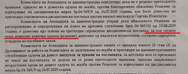 Државниот просветен инспектор Ѓорѓи Илиевски не смеел да биде распределен на пониско работно место, ниту да му се намали платата, сѐ додека не се донесе решение по неговата жалба за постапката која ја водеше дисциплинската комисија, одлучи Комисијата на Агенцијата за администрација за одлучување по жалби и приговори на административни службеници во втор степен. Тие му наложуваат на Државниот просветен инспекторат(ДПИ) да ја прекине оваа постапка.