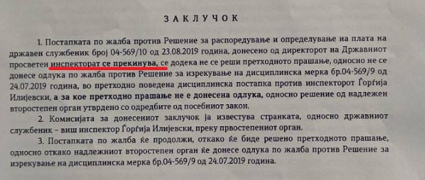 „Постапката по жалба против Решение за распоредување и определување на плата на државен службеник, донесена од директорот на Државен просветен инспекторат се прекинува“.