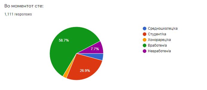 Најголем дел од оние што одговарале на анкетата се вработени лица – 58,7 отсто. Втори што пријавиле интерес да одговараат се студентите – 26,9 отсто. Далеку зад нив се одговорите на невработените – 7,7 отсто, средношколците – 4,2 отсто и на крај на хонорарците – 2,4 отсто.