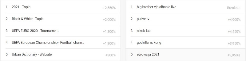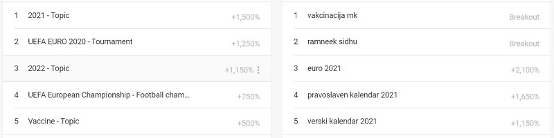 Ќе почнеме со сите категории, каде што најпребарувана тема е 2021, по што следуваат УЕФА ЕУРО 2020 (Европското првенство во фудбал), 2022 и вакцина. Истовремено, петте најпребарувани термини изминатава година биле поврзани со вакцинацијата, фудбалот и празниците, односно: вакцинација.мк, Рамнеек Сиду, ЕУРО 2021, православен календар 2021 и верски календар 2021.