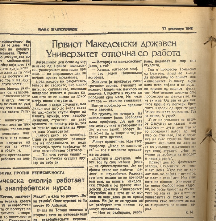 „Ве поздравувам во името на новоизбраното професорско тело и го објавувам отворањето на новооснованиот Македонски државен универзитет... македонскиот народ го прославува големиот празник со достојно дело...“ Со Филозофскиот факултет започнува сè: значајниот библиотечен фонд создаден пред војната при факултетот бил преземен во Народната библиотека, преименувана во Народна универзитетска библиотека.