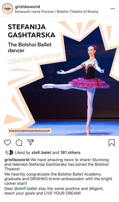 Македонската балерина Стефанија Гаштарска стана дел од ансамблот на многу посакуваниот руски театар „Бољшој“ во Москва. 18-годишната балерина од Скопје е прва Македонка на која ѝ успеа тоа. Таа настапи на сцената на овој театар уште пред две години како солистка. Гаштарска е бренд-амбасадор на компанијата „Гришко“, која ги прави светски познатите балетанки.