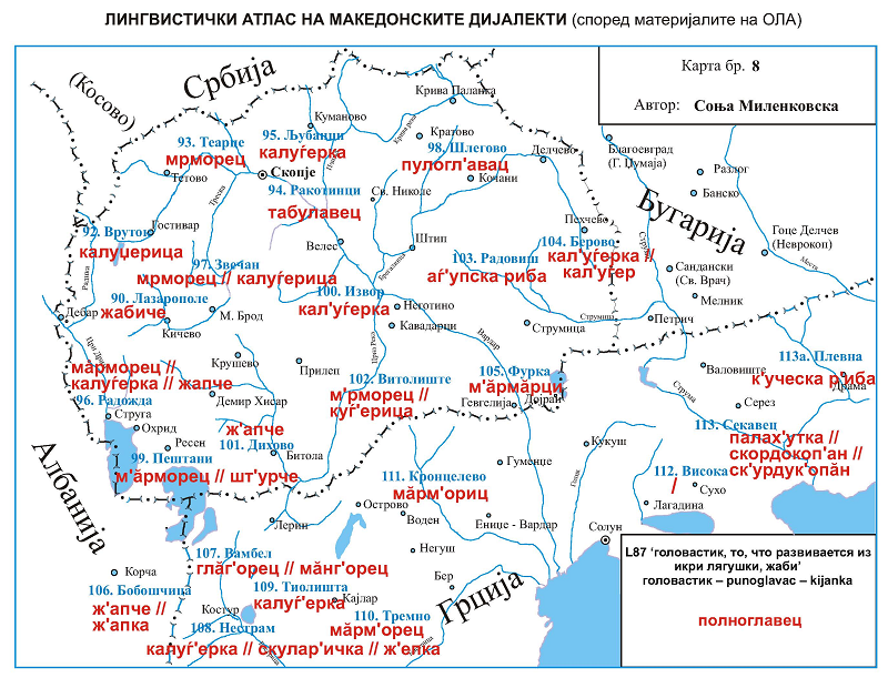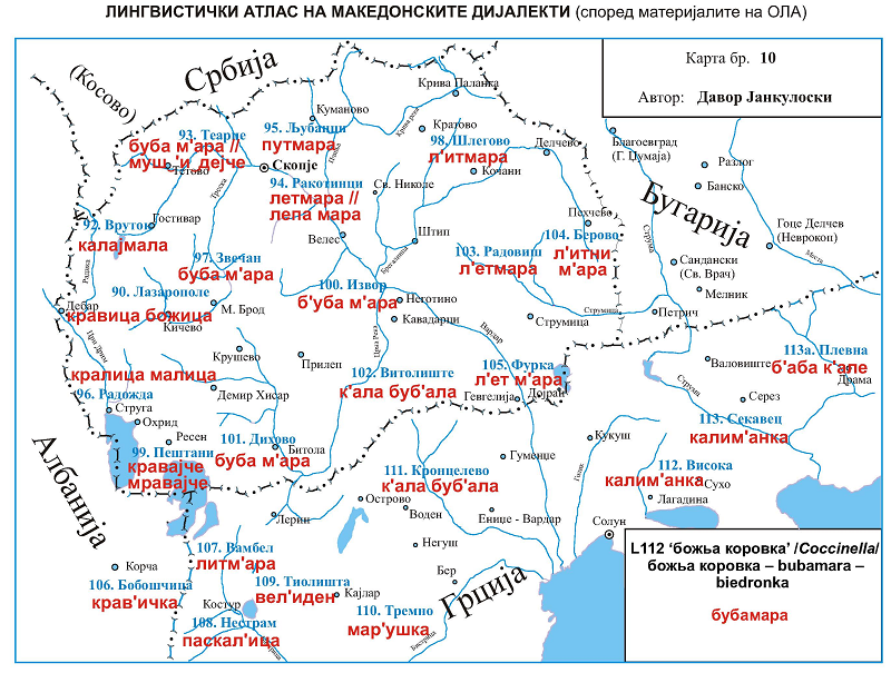 - Во Лингвистичкиот атлас на македонските дијалекти (според материјалите на ОЛА) се поместени 50 карти и легенди кои ја покриваат македонската дијалектна територија претставена во мрежата на населени пунктови во рамките на Општословенскиот лингвистички атлас – ОЛА. Се работи за 24 населени места, од кои 15 се наоѓаат на територијата на Р.С. Македонија, 1 на територијата на Р. Албанија и 8 населени места на територијата на денешна Р. Грција. Изборот на картите е направен во однос на тоа колкава е разнообразноста на називите што се јавуваат на македонската дијалектна територија и во однос на нивната поврзаност со другите словенски дијалекти. Иако картите на ОЛА (претставени со 850 населени места на цела словенска територија) се објавувани со знаци и симболи, во картите на овој атлас се давани целосните називи (во кирилична транскрипција) кои се јавуваат на македонската дијалектна територија (според ОЛА).