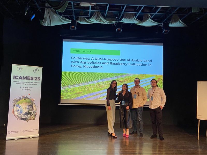Студентите од Факултетот за електротехника и информациски технологии (ФЕИТ) учествуваа на меѓународниот натпревар ICAMES и оваа година проектот „SolBerries: A Dual Purpose Use of Arable Land with Agrivoltaics and Raspberry Cultivation in Polog, Macedonia“ на Емилија Наумоска, Милош Милошевиќ, Ангела Мешкова и Стефан Мерџаноски, изработен под менторство на асс. м-р Александар Крлески, ја освои главната награда за најдобра презентација.