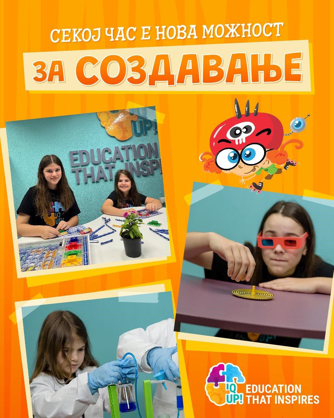 IQ UP! е иновативен едукативен центар кој ја трансформира перцепцијата на децата за учење. Програмите се дизајнирани од искусни педагози, психолози, логичари и научни комуникатори со единствена цел да ја активираат природната љубопитност на секое дете.