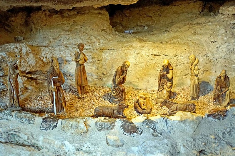 „Кога пристигнале во Витлеем, за нив немало место во гостилниците и куќите зашто многу народ дошол за пописот. За да им помогнат, некои добри луѓе ги упатиле во една пештера во близина на градот, каде што пастирите при невреме ги засолнувале овците и козите. Ноќта силна светлина ја исполнила пештерата и околните ридови и Марија Богородица го родила својот Син првенец во јаслите на пештерата“, пишува Китевски во својата книга.