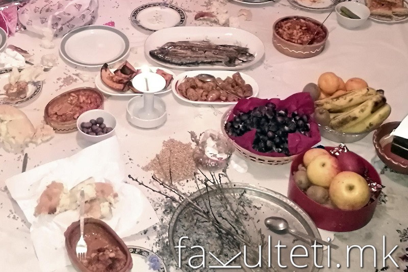 „Трпезата е богата, но исклучително со посна храна – питулици, сарма, грав, компир, риба, зелник, овошје. Целта е по принципот на имитативна магија да обезбеди богат род на земјоделските култури. Обичај е по вечерата софрата да не се крева, туку храната да остане цела ноќ. Ова е поврзано со верувањето дека навечер ќе дојде дедо Боже и ќе јаде. На Бадник во секој куќа се меси кравајче, пита или погача во која се става пара. Сите присутни ја бараат парата и тој што ќе ја најде, се смета за најсреќен во годината што претстои. Парата се става во чаша со вино од која сите пиеле за здравје и среќа“, пишува Китевски во книгата.