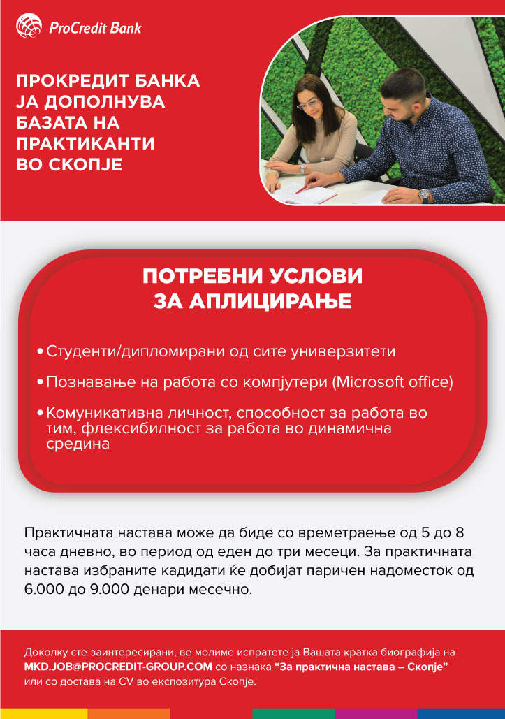 Мејл за аплицирање: mkd.Job@procredit-group.com