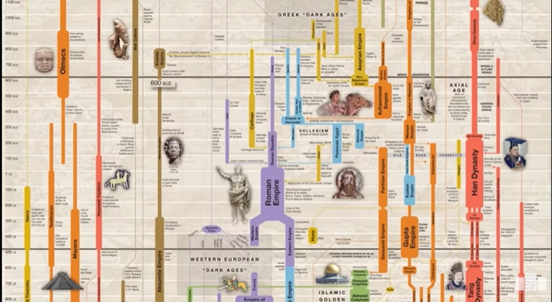 Како што раната бронзена доба ѝ отстапува место на бронзената доба, бронзената доба ѝ отстапува место на железната доба, а железната доба на класичната антика... овие линии на цивилизација се згуснуваат во линии на империи. Ниедна не е подебела од онаа на Античкиот Рим, кој го зафаќа центарот на визуализацијата, но силата на дизајнот лежи помалку во нагласувањето на важноста на која било империја, а повеќе во откривањето колку историја се случувала низ целиот свет во кое било време.