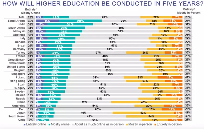 Додека вториот бран на коронавирусот почна да се шири во октомври, повеќе од 27.500 возрасни лица во 29 земји биле запрашани како го замислуваат високото образование во нивната земја за пет години. Речиси три четвртини (72 отсто) од испитаниците рекле дека високото образование во нивната земја ќе се одвива онлајн барем толку колку што ќе се одвива со физичко присуство, ако не и повеќе.