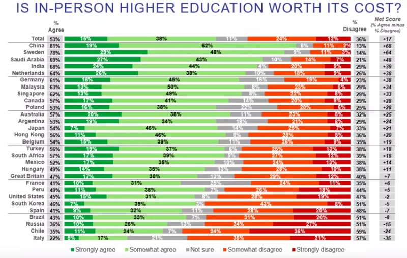 Најсогласни се жителите на Кина (81%), Шведска (78%), Саудиска Арабија (69%), Индија (68%), Холандија (64%), Малезија (63%), Сингапур (62%), и Германија (61%). Истовремено, во Чиле (59%), Италија (57%), Русија (51%), Бразил (51%) и Јужна Кореја (51%) повеќе од половината од испитаните возрасни лица сметаат дека високото образование во кое наставата се одвива со физичко присуство не вреди.