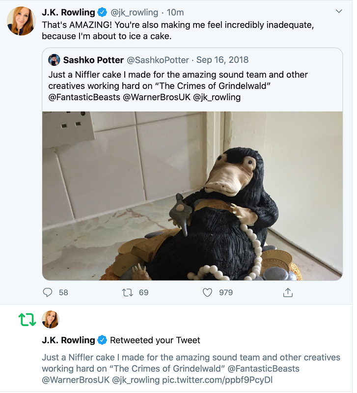 Кога завршивме со снимањето на „Фантастични ѕверки 2“, сам направив торта со ликот на Нифлер од филмот и ѝ ја пратив на екипата на филмот во „Ворнер брос“. Се израдував кога пред некој ден и Џ. К. Роулинг го ретвитна постот и ми пиша порака.