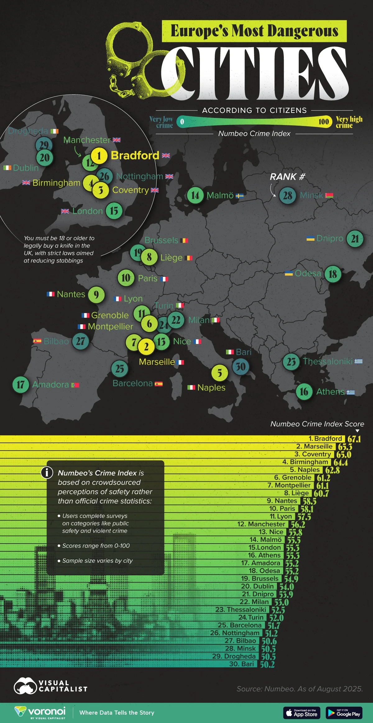 Каде Европејците се чувствуваат небезбедно? За да дојдеме до одговорот на ова прашање, треба да ги погледнеме резултатите од индексот на криминал на „Нумбео“, кој открива како луѓето ја перципираат безбедноста во нивниот град, од средината на 2025 година. За разлика од официјалните статистики за криминал, овој индекс го отсликува чувствата на јавноста преку истражувања направени со голем број луѓе.