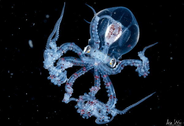 Фотографиран млад проѕирен октопод на кој му се гледа мозокот