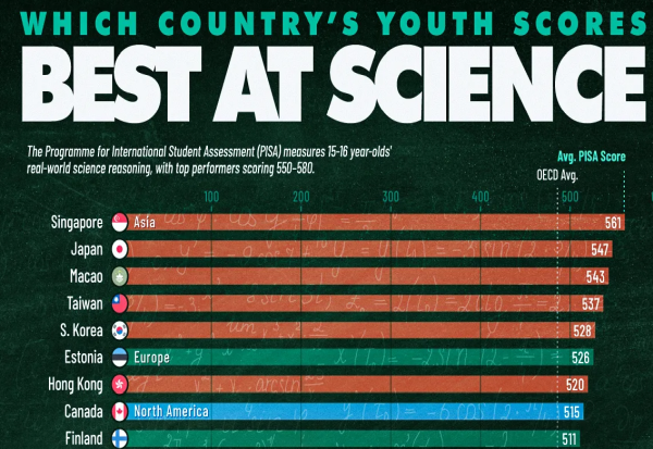 Овој инфографикон ги рангира земјите според просечните резултати во наука во најновите ПИСА-тестови.