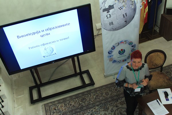 Предавачи беа претседателката на здружението, Снежана Штрковска, која присутните ги запозна со работата на здружението, Игор Кузмановски, професор по хемија на Природно-математичкиот факултет од Скопје, кој се осврна на референците во Википедијата и како таа се користи како алатка и во високообразовните институции. М-р Матилда Бајкова, професорка по македонски јазик и литература, се задржа на образовната цел на користењето на Википедија како медиум во наставата и со практични примери и упатства до своите колеги посочи свои искуства од наставниот процес во користењето на информатичката технологија на часовите на кои учениците се партнери во процесот на учење.