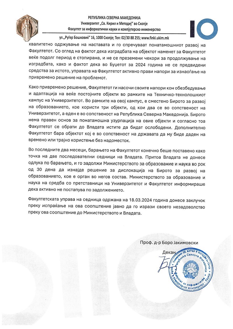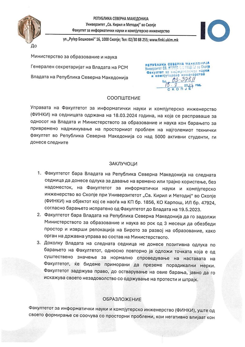 На седницата на Управата на ФИНКИ одржана денеска, на која се расправало за односот на Владата и Министерството за образование и наука кон барањето за привремено надминување на просторниот проблем на факултетот, биле донесени следните заклучоци: