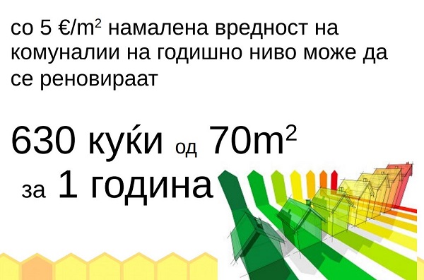 На пример, во 2018 година се изградени 459.352 м2 станбена површина. Доколку оваа површина ја помножиме со претпоставените 5 евра по квадратен метар стимулација од општините и доколку претпоставиме дека трошоци за реконструкција на куќа од 70 м2 се во износ од 3.650 евра, доаѓаме до резултат дека за една година покрај нови објекти, може да се реконструираат и 630 куќи од по 70 м2. Или со изградба на една просечна зграда од 3000 м2 може да се реконструираат 4 куќи од по 70. Оваа бројка е импозантна, за 10 години - 6.300 куќи. Претпоставувам дека во Македонија има околу 50.000 домаќинства. 6.300 домаќинства се околу 12%. Реално процентот е многу поголем бидејќи дел од населението живее во домаќинства во рурални средини, дел во станбени згради кои од 2015 година се градат како енергетски ефикасни објекти.
