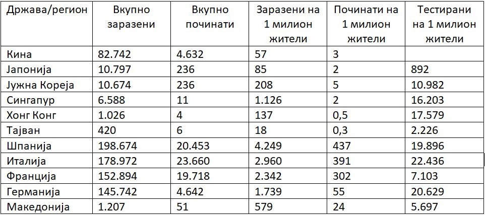 Табела 1. Податоците за Ковид-19 се однесуваат за 20 април 2020 година. Податоците за смртност на Ковид-19 се процени (опсегот се менува во зависност од државите)