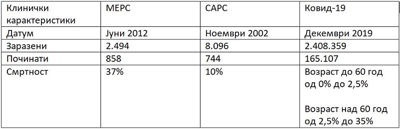 „Природа“, епидемијата почна на 12.12.2019 и до 26.01.2020 година предизвика 2.794 лабораториски потврдени инфекции и 80 смртни случаи. Табела 1 ги сумира раните клинички карактеристики на Ковид-19 споредени со епидемиите на МЕРС и САРС.