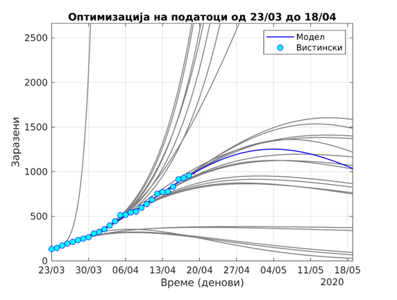 11.04 на Факултети.мк. Официјални податоци за 20 април 2020 година се: вкупно заразени 1.207, вкупно починати 51, заразени (активни) 977 и (оздравени) 179. Според моделот, се очекува максималниот број на активно заразени (не вкупно заразени) да биде околу 1.200, а тоа да се случи во почетокот на мај.