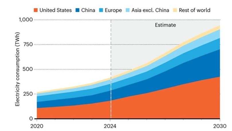 Според Меѓународната агенција за енергија (IEA), центрите за податоци учествувале со околу 1,5 % од светската потрошувачка на електрична енергија во 2024 година, или 415 TWh (терават-часови). Учеството на САД било најголемо (45 %), по што следуваат Кина (25 %) и Европа (15 %). Потрошувачката на електрична енергија во центрите за податоци се очекува да се зголеми повеќе од двојно, на околу 950 TWh до 2030 година. Ова е малку повеќе од вкупната потрошувачка на електрична енергија во Јапонија денес.