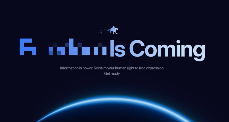 На страницата е прикажан слоганот „Информацијата е моќ. Вратете го вашето човеково право на слободно изразување. Подгответе се“, со графика од бел коњ што галопира над Земјата.