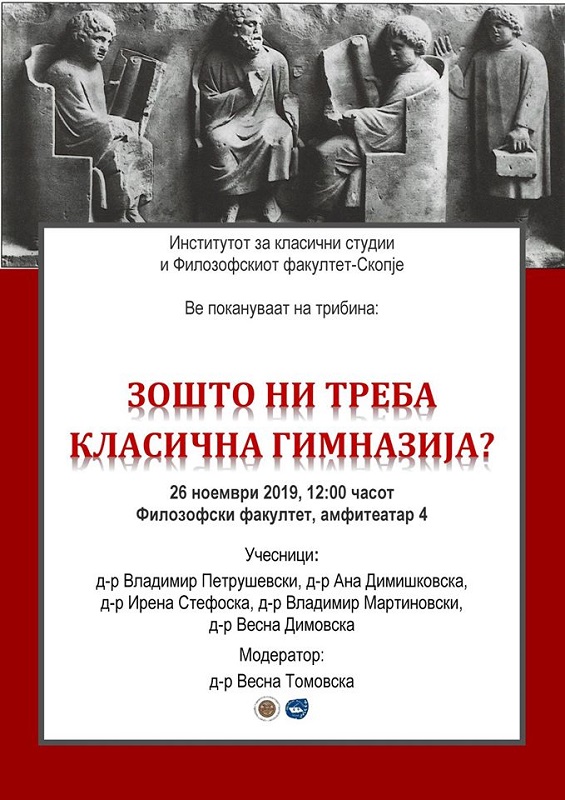 вклучено класичното образование во нашиот образовен систем, како да се спроведат реформите, зошто е важно познавањето на класичните јазици. Под класично образование се подразбира изучувањето, пред сè, на класичните јазици (латинскиот и старогрчкиот), античката книжевност и култура, историја, уметност, филозофија и слично.