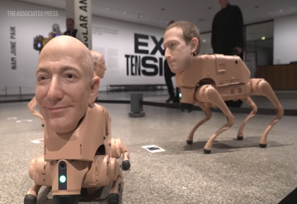 Роботски кучиња со главите на Илон Маск и Марк Закерберг „шетаат“ низ музеј во Берлин