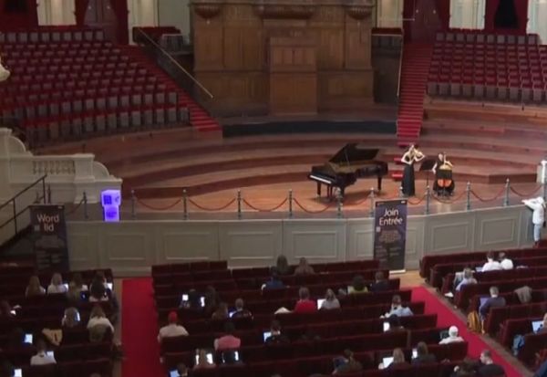 Од сцената на концертната сала во Амстердам, виолинистката Хјунџин Чо и виолончелистката Ефстратија Халулаку набљудуваат редици млади лица осветлени од сјајот на екраните од нивните лаптопи.