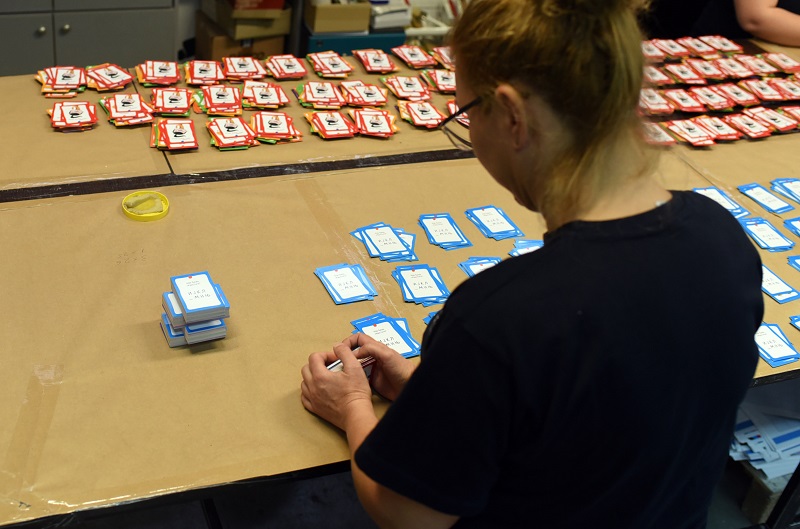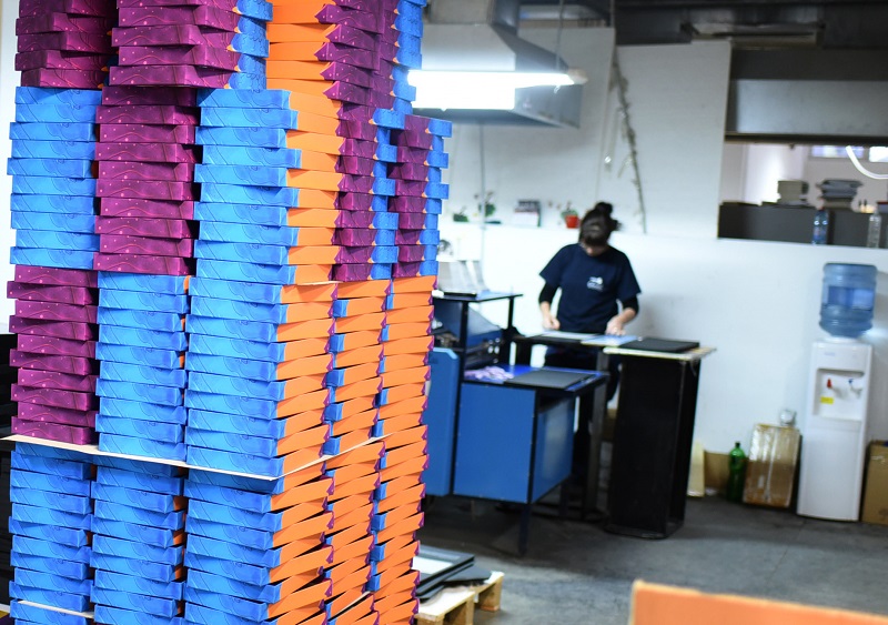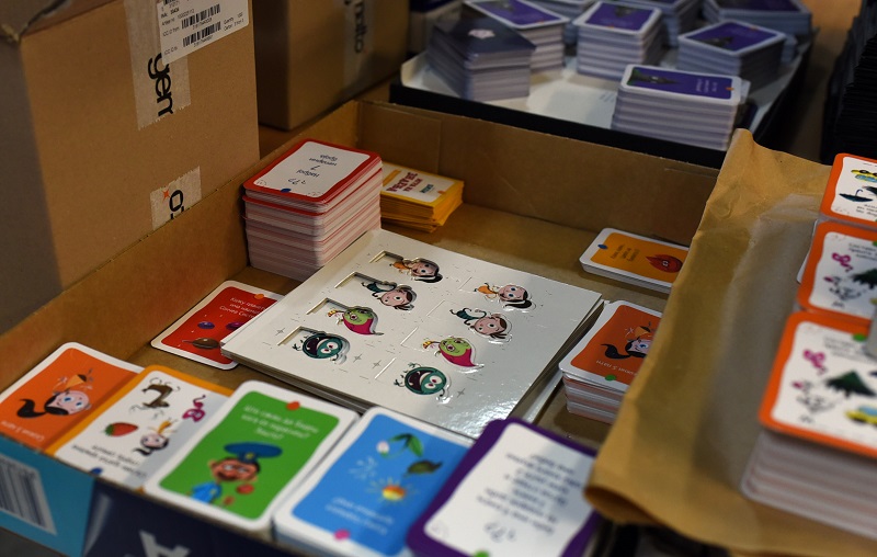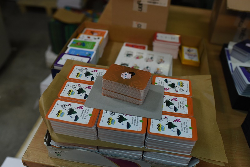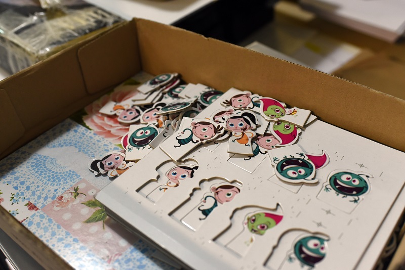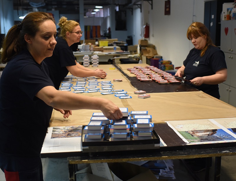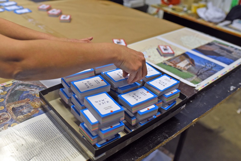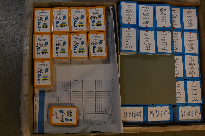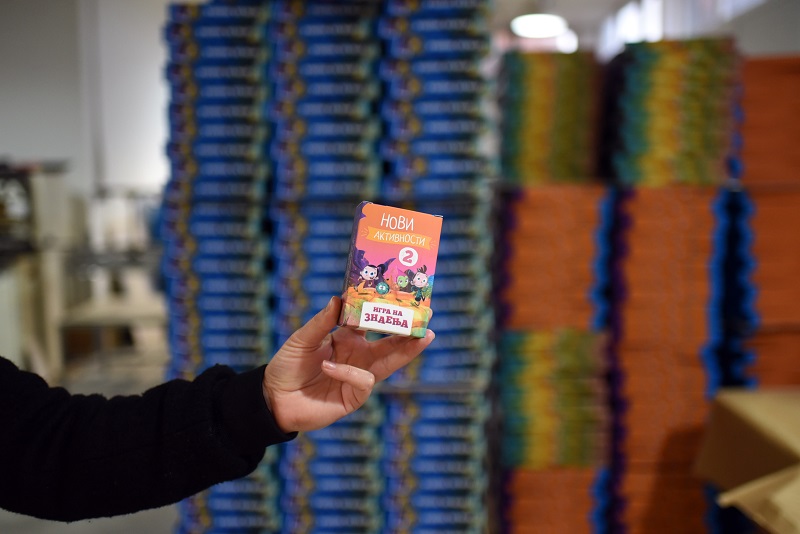 - Конкретно за овој производ има многу рачна доработка, навистина е специфичен. Ништо не оди на машина, сѐ оди на рака. Лепење на табаците, формирање, рачно обликување. Кутијата е навистина специфична за изработка, но и самите фигури, картичките со активности. На пример, им се сечат ќошињата за да немаат остри врвови, да бидат безбедни за децата. Потоа неколку вработени ги сортираат картите според боја и потоа сите производи се ставаат во кутијата - вели Анка Тодорова, шеф на одделот книговезница.