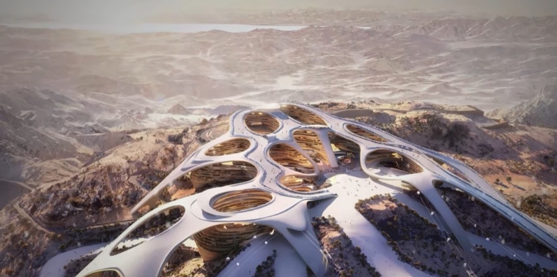 Според генералниот план на германското архитектонско студио ЛАВА, одморалиштето моментално е во изградба во планинскиот регион Табук на северозападниот дел од земјата. Ќе биде уредено околу огромно вештачко езеро и ќе има згради дизајнирани од „УН Студио“, „Заха Хадид Архитектс “ и „Аедас“.