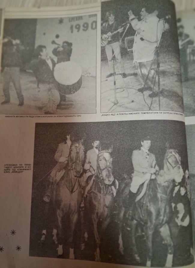 - Забавата почна околу 18:30 часот кога на сцената се качија милениците на најмладите „Шарките и барките“, кои го бараа и го дочекаа Дедо Мраз. Потоа на сцената настапија над триесет пејачи и артисти кои ги подгреаја срцата на граѓаните и ја вжештија атмосферата. Отуѓеноста и осаменоста беа избришани како гума. Највесело, се разбира, беше на полноќ кога Скопје беше осветлено со волшебниот огномет. „Леб и сол“ чукнаа три пати за среќа и здравје на многубројните граѓани со песните „Чукни во дрво“, „Скопје“, „Среќна Нова“.... Кога прозвучеа звуците на песната „Југославијо“, сите заиграа и се фатија во непрегледното оро - раскажува Апостолов.